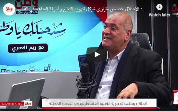 قال رئيس الإئتلاف التربوي الفلسطيني، والحملة العالمية للتعليم، رفعت صباح، إن الاحتلال يرفع شعار " لا نريد تعليماً للفلسطينيين بالقدس" ويتبع اسلوباً خطيراً من أجل تفريغ نظام التعليم في القدس من المنهاج الفلسطيني لاعتباره منهاجاً وطنياً. موكداً أن الاحتلال قد خصص ملياري شيكل من أجل تهويد التعليم وأسرلة المنهاج والسيطرة عليه.