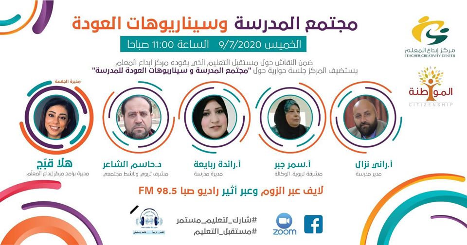 ضمن اللقاءات التي ينظمها برنامج المواطنه في مركز ابداع المعلم ، يسعدنا انضمامكم و مشاركتكم في نقاش سيناريوهات العوده من وجهه نظر اطراف العمليه التعليميه ، اللقاء يوم الخميس الساعه ١١ صباحا عبر زوم من خلال الرابط: