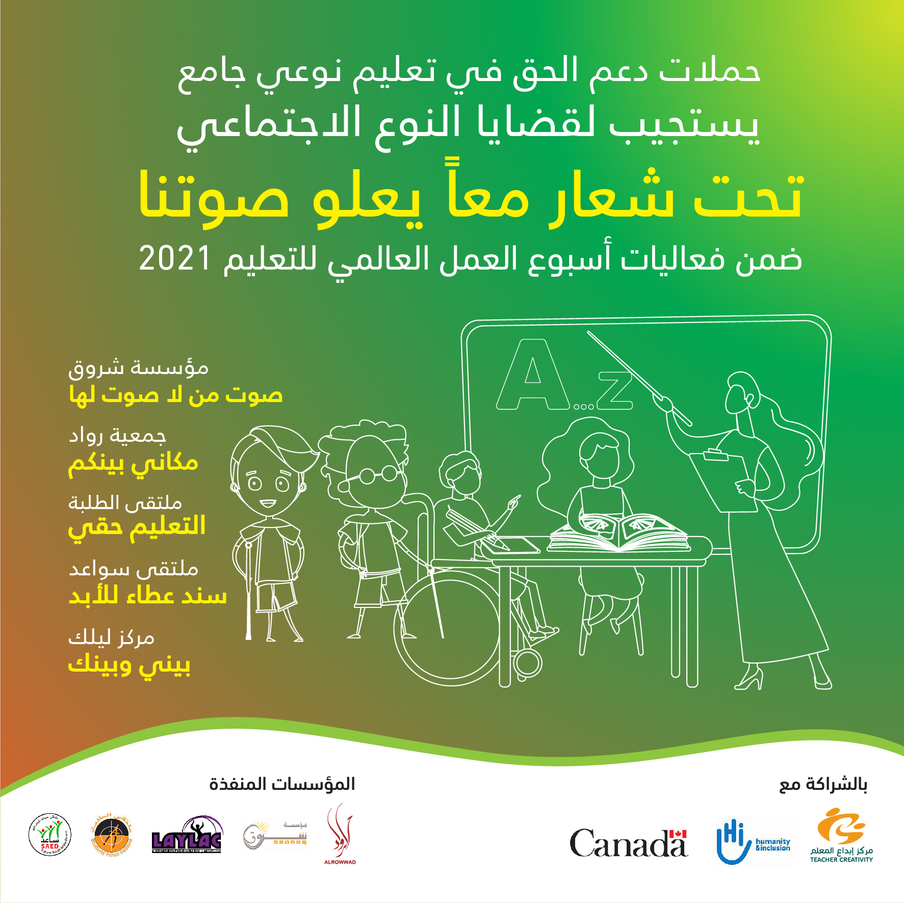 مركز ابداع المعلم والمؤسسات الشريكة ضمن الائتلاف التربوي الفلسطيني يطلقون اليوم وبالتزامن مع أسبوع العمل العالمي للتعليم 2021 حملات ضغط ومناصرة تنفذها مؤسسات المجتمع المدني في بيت لحم والخليل وبالشراكة مع مؤسسة Humanity and Inclusion تهدف الى دعم الحق في تعليم نوعي جامع يستجيب لقاضايا النوع الاجتماعي وتحت شعار "معا يعلو صوتنا"