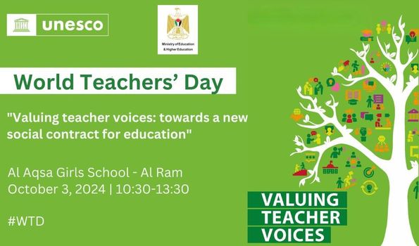 احتفلت وزارة التربية والتعليم الفلسطينية بالتعاون مع اليونسكو بمناسبة اليوم العالمي للمعلم لعام 2024، الذي أقيم في 3 أكتوبر 2024 في مدرسة الأقصى للبنات في الرام، تحت شعار "تقدير أصوات المعلمين"، سلطت الفعالية الضوء على أهمية دور المعلمين في العملية التعليمية وضرورة تقدير مساهماتهم.