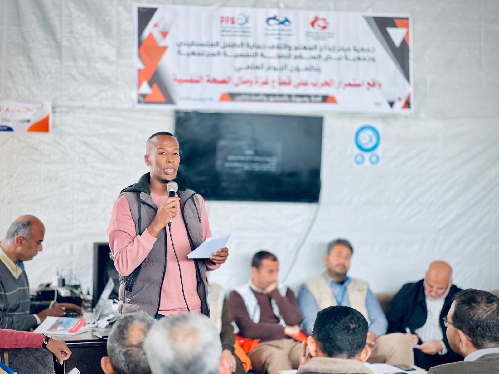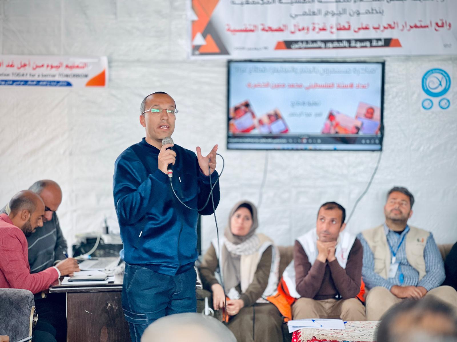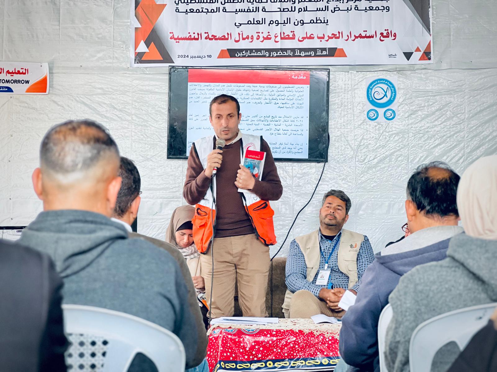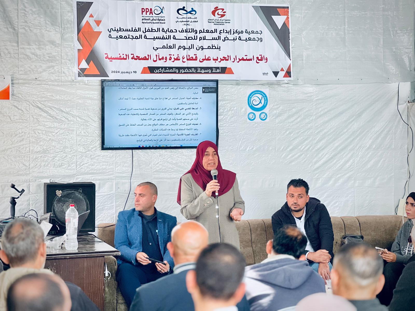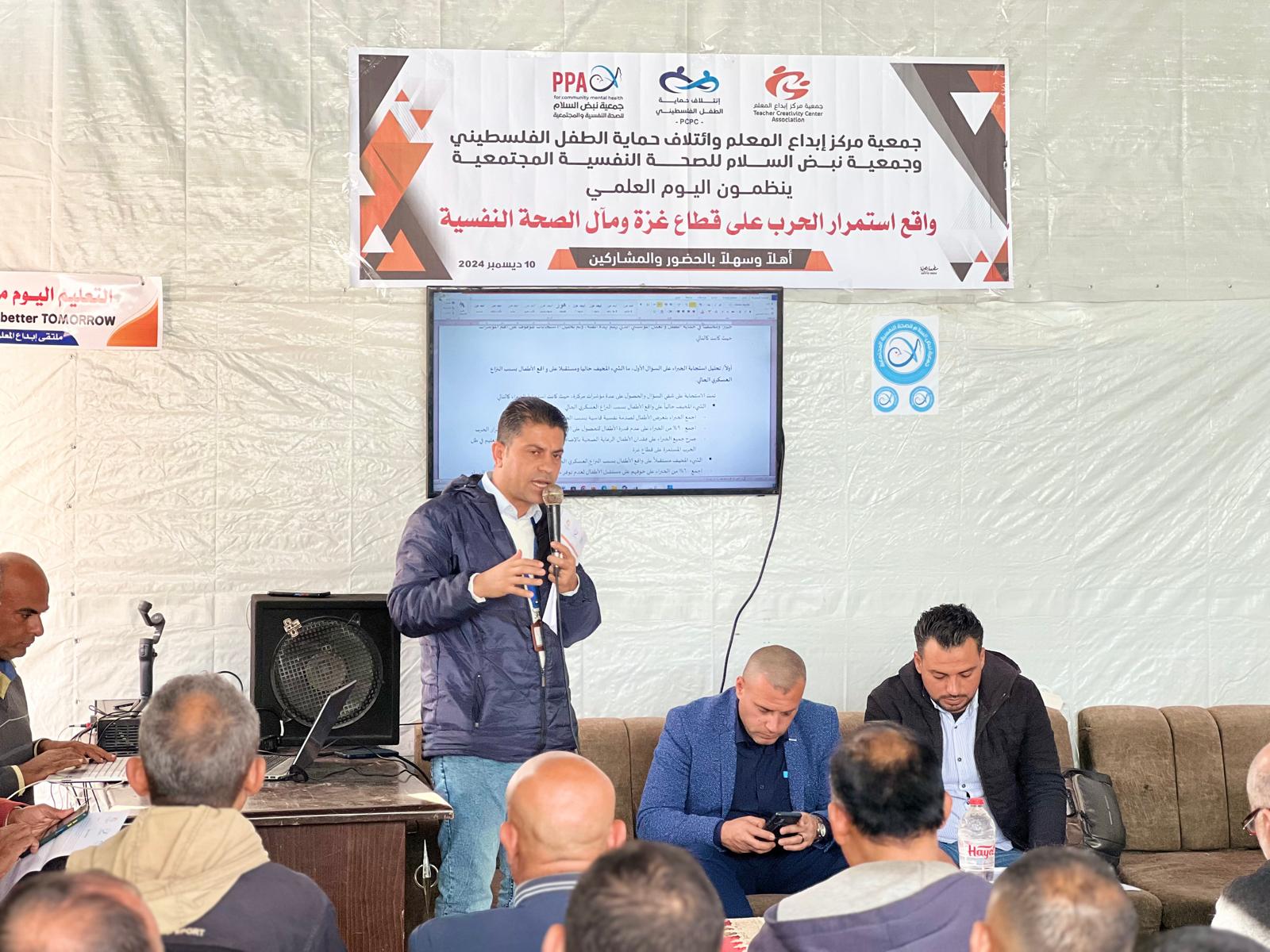 حظى اليوم العلمي بمشاركة فاعلة من مؤسسات المجتمع المحلي والدولي والخبراء المختصين والاكاديميين في الجامعات الفلسطينية ، حيث افتتح اللقاء الاستاذ الدكتور منير رضوان والاستاذ الدكتور عمر دحلان مؤكدين على هدف اللقاء ومشخصين الظروف الراهنة ومتطلعين للخروج بالنتائج التي تساهم في بناء جسم مهني فاعل خلال فترة الطوارئ وما بعدها ، حيث تم عرض أوراق بحثية قام فيها مجموعة من الخبراء وتطبيقها خلال الحرب وبعض النتائج البحثية لموضوعات متنوعة من خلال اراء الخبراء والمختصين في مجال الصحة النفسية والتي ناقشتها الدكتور محمد شبير مدير الجلسة ، حيث عبر الباحثين عن أهمية هذا اللقاء العلمي ودوره في تبادل الخبرات ونقل المعرفة لتبادلها بين الزملاء المختصين والمؤسسات العاملة في وقت الطوارئ ، وقد جاءت الأوراق والمشاركات العلمية مطابقة للواقع والظروف الراهنة ، وتنوعت في عرض العديد من التدخلات التي تساهم في تقديم الحماية للأطفال وجميع الفئات العمرية ، سواء تدخلات الاسعافات النفسية التي أكدت عليها نتائج التجربة الميدانية لجمعية الهلال الأحمر الفلسطيني ،والفنون الادائية في الوقاية من المخاطر الناتجة عن الحرب ، والنتائج ايضا التي تتعلق في المشكلات النفسية التي يعاني منها الأطفال وبرامج الحماية الفاعلة ، وطرق الحماية والتحصين النفسي ، حيث شاركت جمعية برنامج غزة للصحة النفسية في عرض نتائج ميدانية تشخص الواقع وحالات الأطفال وأثر التدخلات الميدانية التي ساهمت في نشر الوعي والوقاية النفسية للأطفال والأهالي منذ بداية الحرب ، وايضا ما يتعلق في دور الأخصائيين والمنشطين في تحسين القدرة على الاستجابة والتكيف مع الظروف الراهنة من خلال الأنشطة الترفيهية والارشادية المنظمة والتي تناولتها جمعية نبض السلام للصحة النفسية، وكما وعرضت جمعية الثقافة والفكر الحر ، نتائج مهمة تتعلق في دور البرامج التي تقدمها الجمعية في تحسين الواقع التعليمي والنفسي للأطفال وتخفيف معاناتهم وتحسين قدرتهم على الصمود النفسي ، أما فيما يتعلق بدور الفنون الادائية ونجاحها في العمل مع الشباب والأطفال فقد عرضت نتائج مهمة ضمن مشاركة جمعية انقاذ المستقبل الشبابي عن تجربتها الفاعلة والمهمة في تحسين الصحة النفسية للأطفال والشباب ، كذلك ما تم عرضه من تجربة ميدانية للأستاذ محمد الخضري الذي أكد على أن العمل مع الأطفال ضمن انشطة التعليم والدعم النفسي ساهمت في وقاية الأطفال من مخاطر الاضطرابات النفسية ، واشار نتائج دراسة ميدانية للباحثة هدى مرجان على أن العنف ضد المرأة أخذ بتزايد نتيجة الواقع الصعب والأزمة المستمرة وتنوعت اشكال العنف ، وما اشارت اليه مدخلة مؤسسة ماجدات بلادي الانتاجية على أهمي تعزيز دور المرأة وخصوصاً في واقع النزاع الأزمات وتوفير لها الإمكانيات التي تساعدها على الصمود ، وضمن تجربة مهارات التعلم العاطفي الاجتماعي في العملية التعليمية وقت الطوارئ شارك مركز ابداع المعلم بعرض تجربته الملهمة والتي أكد على أهميتها الأستاذ سلاح سمارة من خلال نجاحها في العملية التعليمية وتحقيقها نتائج متقدمة فقد ساهمت في مساعدة الأطفال والأهالي على تعلم خبرات ومهارات جديدة في دعمت حالة التوازن النفسي والوعي الذاتي ومواجهة الضغوط ، وقد نوه الباحثين من خلال عرض الأوراق والتجارب العلمية والتي اتفق عليها جميع الباحثين أن هناك مخاطر حقيقية تحيط بالأطفال والأهالي النازحين الذين يعاونون مع واقع الحرب المستمرة وفقدانهم الاحتياجات الاساسية والتي لها انعكاسات خطيرة على مستويات متعددة جسدية ونفسية وعقلية واجتماعية ، وهذا ما وجه نتج عن هذا اللقاء مشاركة فاعلة وخبرات متنوعة ونتائج متقاربة تؤكد على أهمية الاستمرار في تقديم الخدمات مع توحيد الجهود المهنية والتواصل الدائم مع المؤسسات والشركاء لتقديم خدمة تساعد في تحسين الواقع وتهيئة الظروف المناسبة للناس ليستطيعوا استكمال حياتهم والتخلص من القلق والخوف والضغوط تدر