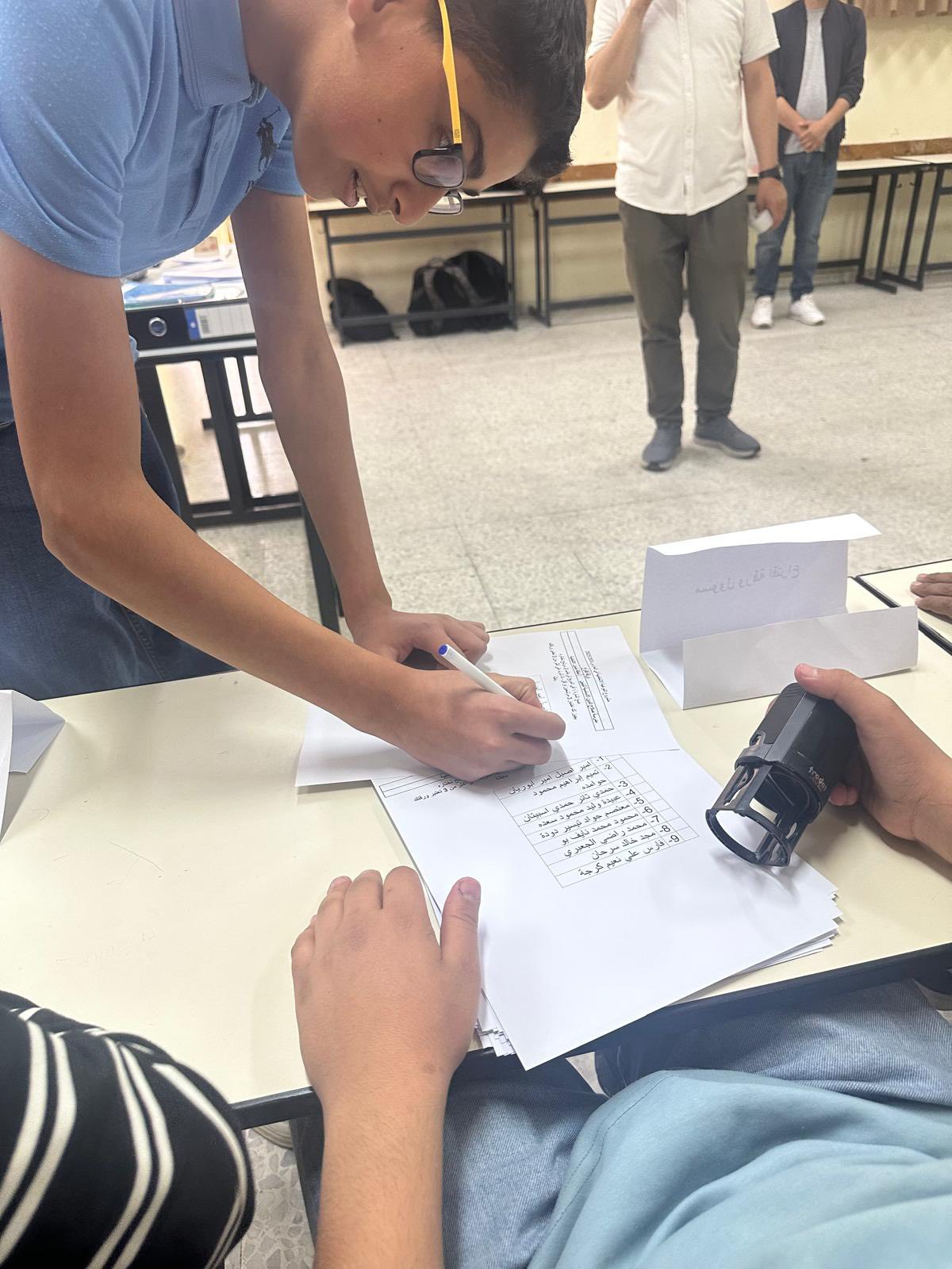 في مشهد يحاكي صناديق الاقتراع الحقيقية وأجواء الانتخابات العامة، نظم مركز إبداع المعلم، وبإشراف قسم الأنشطة الطلابية في وزارة التربية والتعليم، سلسلة من المحاكاة الانتخابية في عدد من المدارس الحكومية، استهدفت طلبة الصف التاسع ضمن مشروع "تعزيز الوعي الانتخابي لدى طلاب الصف التاسع في المدارس الحكومية"، المنفذ بالتعاون مع لجنة الانتخابات المركزية وبدعم من الاتحاد الأوروبي، ضمن المشروع المركزي "الشراكة مع مؤسسات المجتمع المدني".