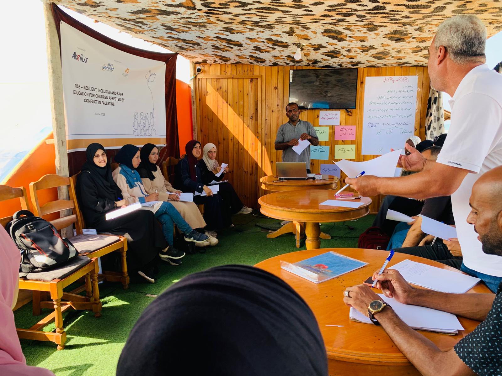 The training, delivered by specialized experts, combined both theoretical and practical components, equipping participants with practical tools and skills to strengthen children’s capacities in temporary learning spaces that will soon be activated. The program seeks to address the significant learning loss caused by the ongoing war in Gaza, while also providing psychosocial support to help children cope with continuous trauma.